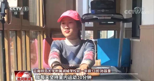 云南師范大學附屬潤城學校初一年級13班 孫辰旻:在爸爸的陪伴下,我每天堅持室內運動30分鐘,室外運動1小時。體育運動不僅能提升我的身體素質,還能不斷磨練我的意志,增強我的自信。