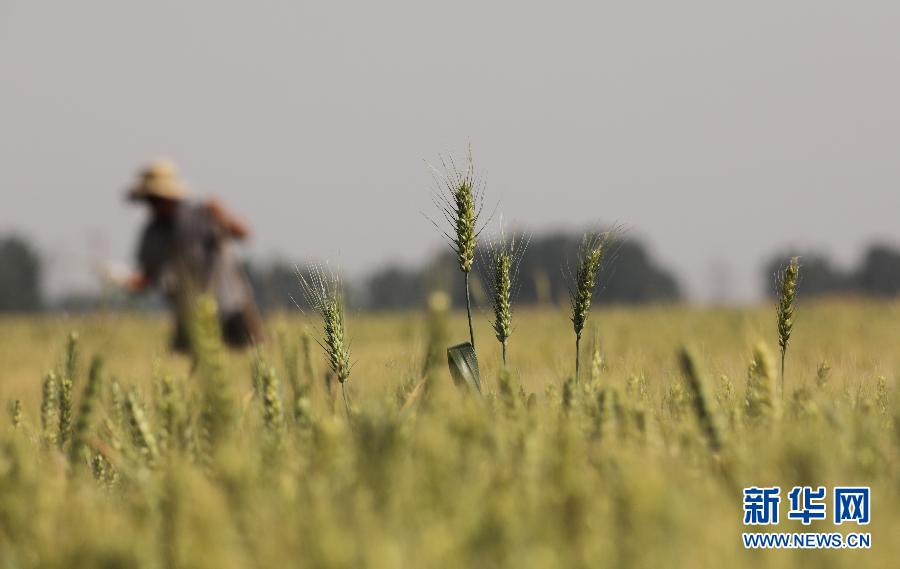 5月20日,河南省武陟縣大虹橋鄉西小虹村農民在麥田里忙碌。 當日是二十四節氣中的小滿。 新華社發(馮小敏 攝)