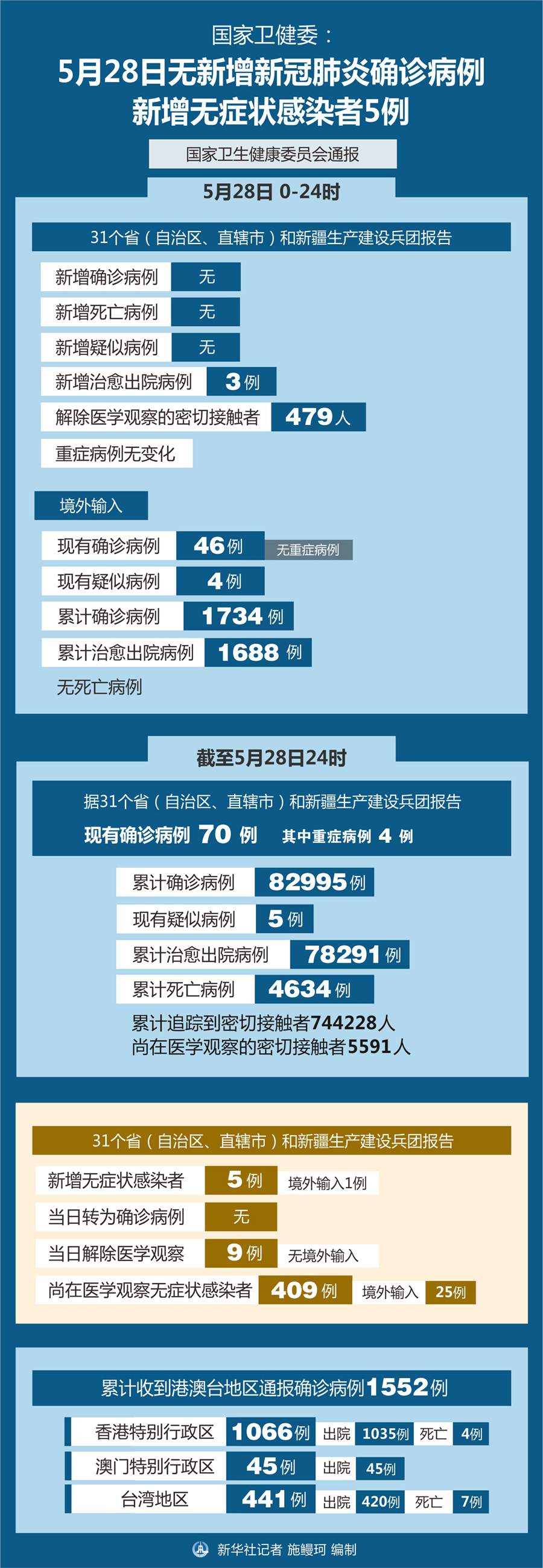 截至5月28日24時,據(jù)31個省(自治區(qū)、直轄市)和新疆生產(chǎn)建設(shè)兵團報告,現(xiàn)有確診病例70例(其中重癥病例4例),累計治愈出院病例78291例,累計死亡病例4634例,累計報告確診病例82995例,現(xiàn)有疑似病例5例。累計追蹤到密切接觸者744228人,尚在醫(yī)學觀察的密切接觸者5591人。