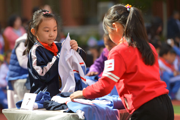 小學學生在進行疊衣服比賽 劉東岳 攝