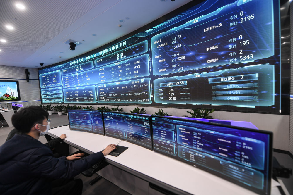 4月2日,在杭州市余杭區(qū)疫情防控工作領(lǐng)導(dǎo)小組指揮部內(nèi),杭州城市大腦精密智控防疫系統(tǒng)顯示疫情防控動態(tài)各項實時數(shù)據(jù)。新華社記者 徐昱 攝