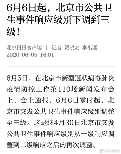 6月6日起北京公共衛生事件響應級別下調到三級-新華網
