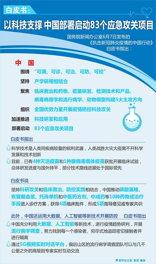新華社北京6月7日電(記者胡喆)國務院新聞辦公室7日發(fā)布的《抗擊新冠肺炎疫情的中國行動》白皮書指出,中國圍繞“可溯、可診、可治、可防、可控”,堅持產學研用相結合,聚焦臨床救治和藥物、疫苗研發(fā)、檢測技術和產品、病毒病原學和流行病學、動物模型構建5大主攻方向,組織全國優(yōu)勢力量開展疫情防控科技攻關,加速推進科技研發(fā)和應用,部署啟動83個應急攻關項目。