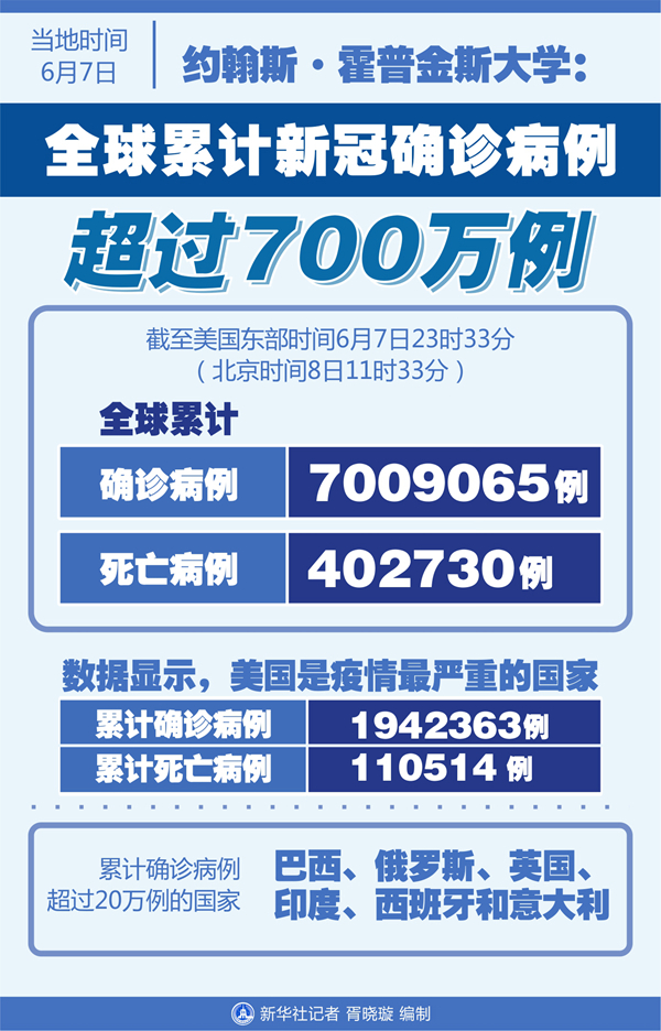 約翰斯·霍普金斯大學(xué):全球累計(jì)新冠確診病例超700萬例-新華網(wǎng)
