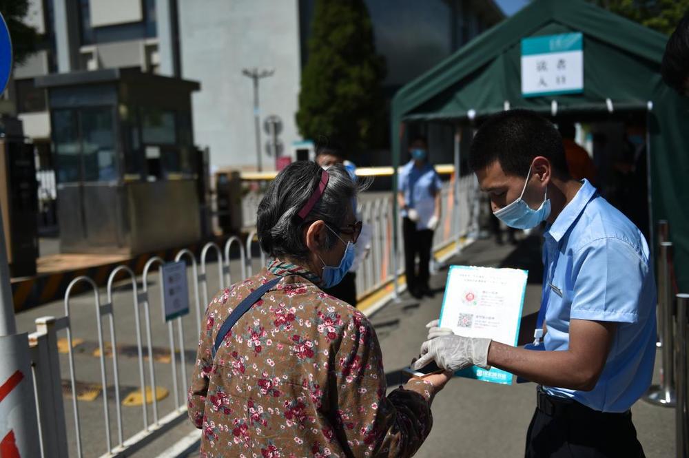 5月11日,在北京市海淀區的北京市十一學校龍樾實驗中學,初三年級學生進入學校前掃描“健康碼”。新華社記者?任超?攝