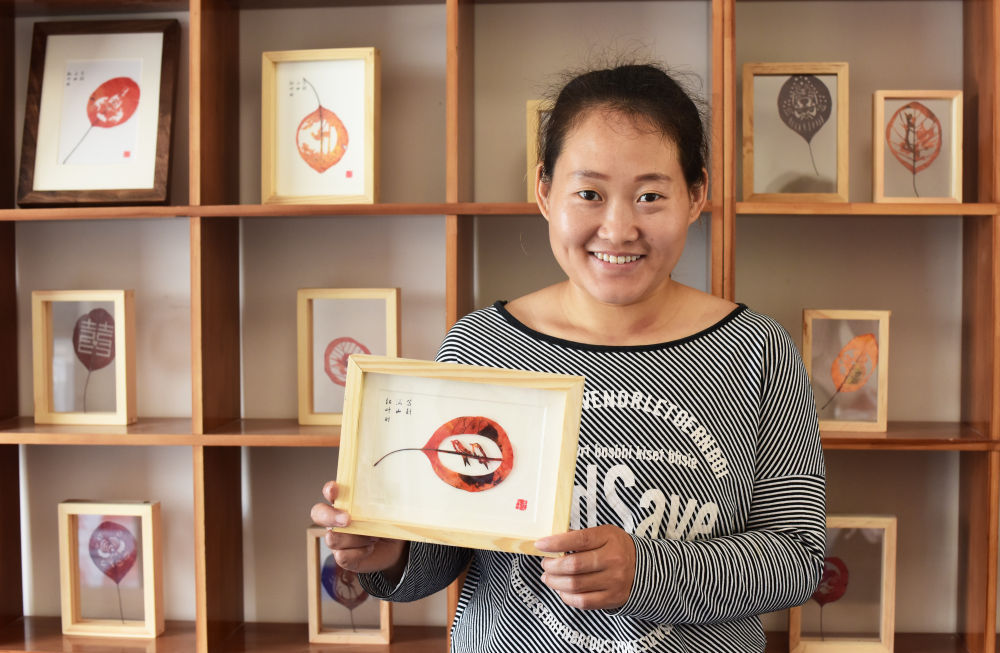重慶市巫山縣雙龍鎮安靜村村民劉忠梅在紅葉藝術品加工工坊內展示紅葉產品(5月26日攝)。新華社記者 王全超 攝