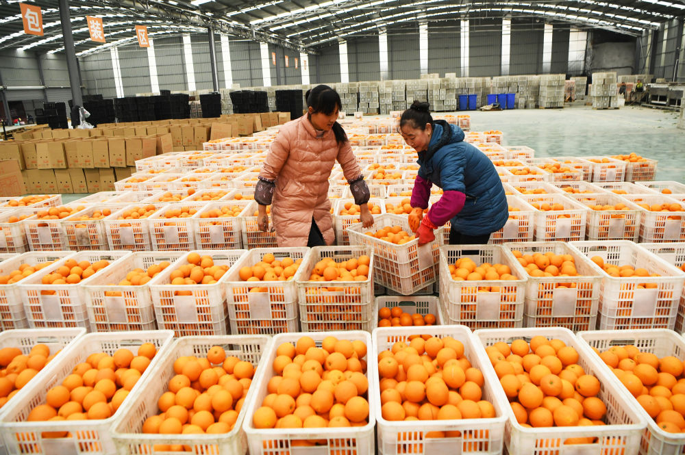 位于奉節縣白帝鎮的重慶橙楊生態農業有限公司工作人員在臍橙分選包裝車間內擺放臍橙(2019年2月13日攝)。新華社記者 王全超 攝