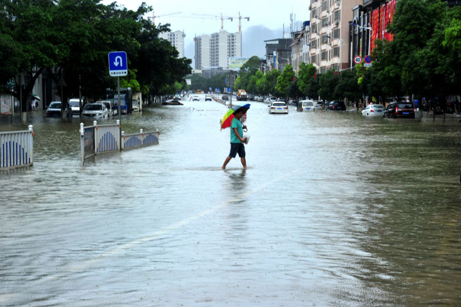 6月5日,在廣西羅城仫佬族自治縣解放路一積水區域,人們涉水出行。(新華社發)