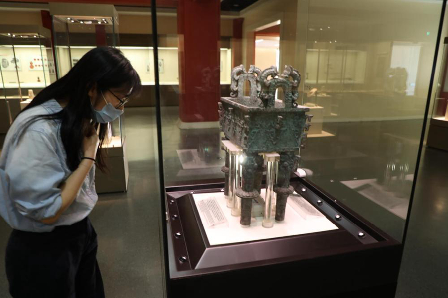 “造型雄偉,工藝精湛,鼎口雙耳上浮雕雙獸,腹部四面用圓雕、浮雕技法,分別飾有垂葉紋和饕餮紋,四角扉棱突起,別具風(fēng)格,最有趣的是鼎的柱足也裝飾有扉棱,并在中間裝飾有圓盤,這在商周青銅器中是獨(dú)一無二的。”陳卓說。