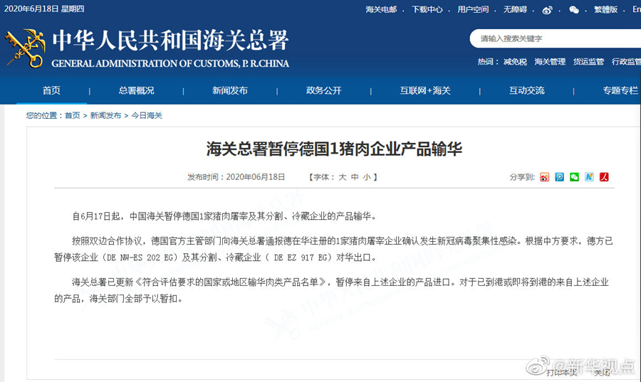 德國一家豬肉企業發生新冠病毒感染,海關總署緊急叫停相關進口-新華網