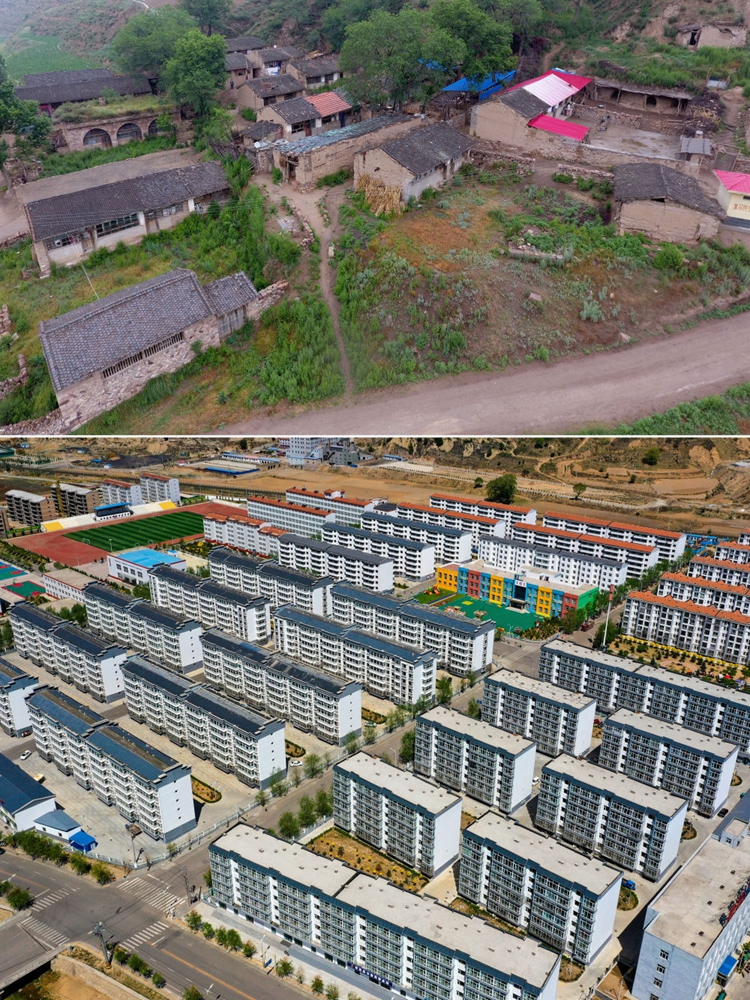 拼版照片:上圖為2017年6月22日拍攝的山西省忻州市岢嵐縣趙家洼村(無人機(jī)照片);下圖為5月20日拍攝的岢嵐縣廣惠園移民新區(qū),部分趙家洼村村民居住在這里(無人機(jī)照片)。新華社記者 曹陽 攝