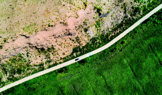 一輛汽車行駛在榆林市橫山區沙漠治理與未治理的分界公路上(2018年8月4日無人機拍攝)。