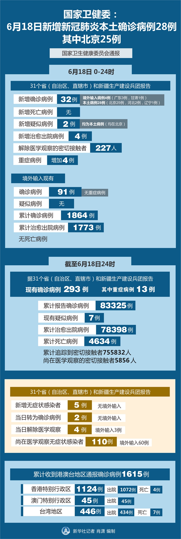 截至6月18日24時(shí),據(jù)31個(gè)省(自治區(qū)、直轄市)和新疆生產(chǎn)建設(shè)兵團(tuán)報(bào)告,現(xiàn)有確診病例293例(其中重癥病例13例),累計(jì)治愈出院病例78398例,累計(jì)死亡病例4634例,累計(jì)報(bào)告確診病例83325例,現(xiàn)有疑似病例7例。累計(jì)追蹤到密切接觸者755832人,尚在醫(yī)學(xué)觀察的密切接觸者5856人。