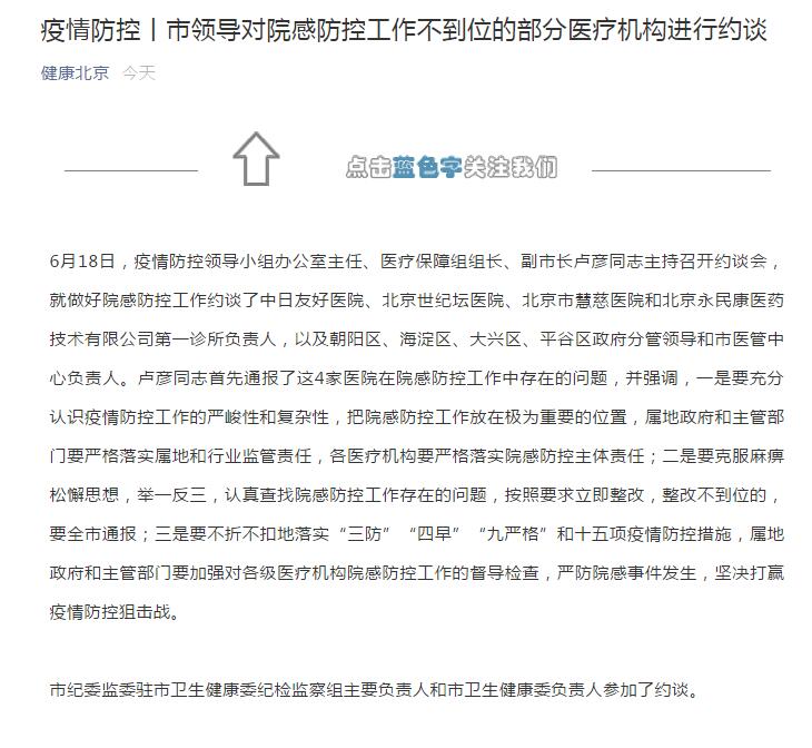 據(jù)北京市衛(wèi)健委微信公眾號(hào)消息,6月18日,疫情防控領(lǐng)導(dǎo)小組辦公室主任、醫(yī)療保障組組長(zhǎng)、副市長(zhǎng)盧彥同志主持召開約談會(huì),就做好院感防控工作約談了中日友好醫(yī)院、北京世紀(jì)壇醫(yī)院、北京市慧慈醫(yī)院和北京永民康醫(yī)藥技術(shù)有限公司第一診所負(fù)責(zé)人,以及朝陽(yáng)區(qū)、海淀區(qū)、大興區(qū)、平谷區(qū)政府分管領(lǐng)導(dǎo)和市醫(yī)管中心負(fù)責(zé)人。