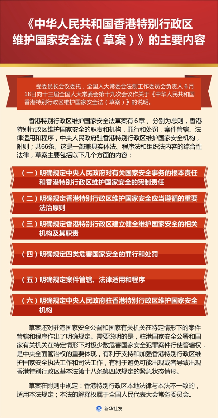 香港特別行政區(qū)維護國家安全法草案有6章,分別為總則,香港特別行政區(qū)維護國家安全的職責和機構,罪行和處罰,案件管轄、法律適用和程序,中央人民政府駐香港特別行政區(qū)維護國家安全機構,附則;共66條。這是一部兼具實體法、程序法和組織法內容的綜合性法律,草案主要包括以下幾個方面的內容: