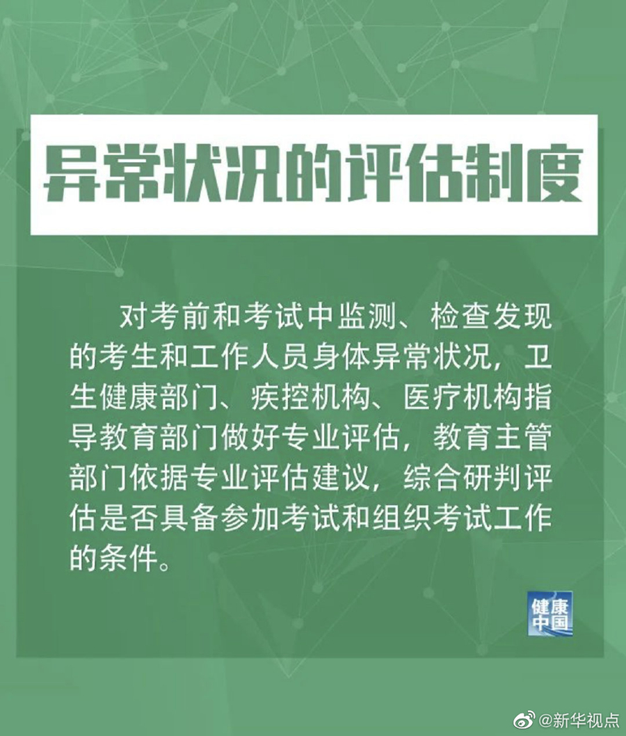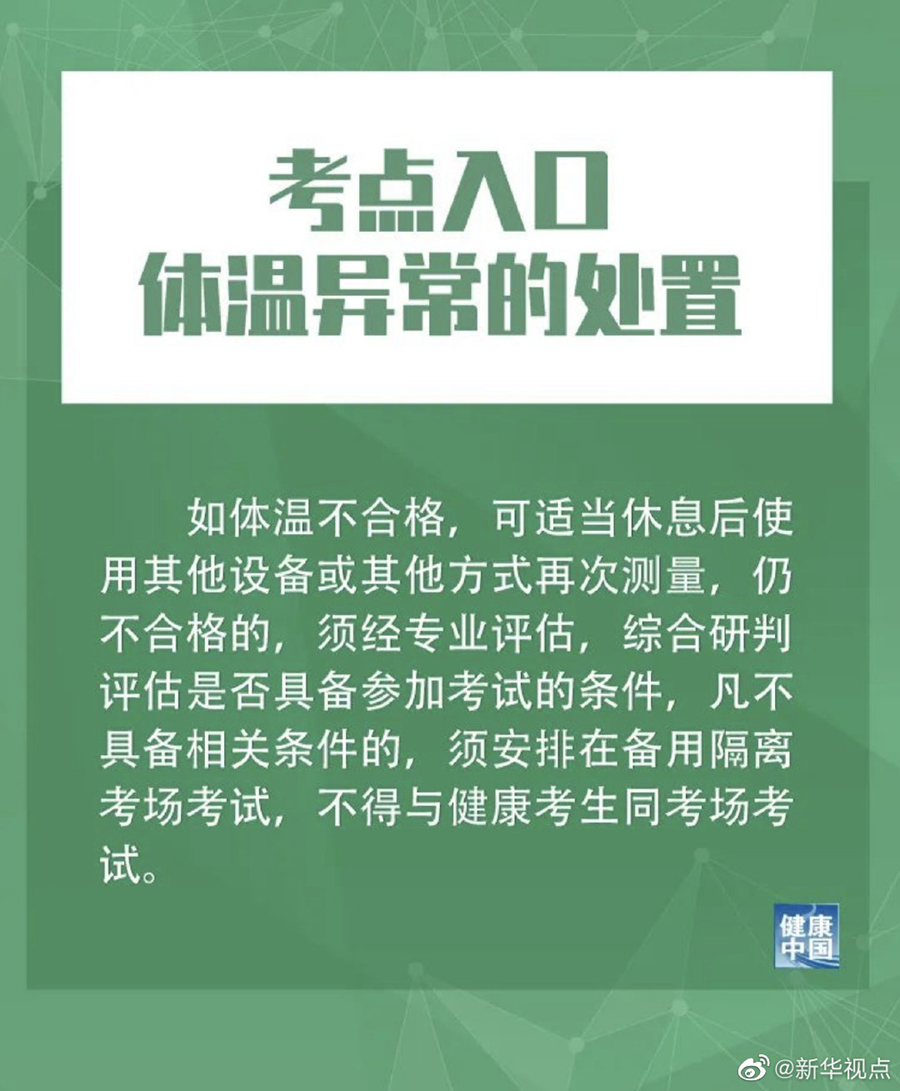 考試過程中有發(fā)熱、咳嗽等呼吸道癥狀者,措施提到,由考點當?shù)氐男l(wèi)生健康部門、疾控機構和醫(yī)療機構專業(yè)人員進行個案研判,具備繼續(xù)完成考試條件的考生,須安排在備用隔離考場考試。考生從普通考場轉(zhuǎn)移至備用隔離考場(未出考點)所耽誤的時間,經(jīng)省級招生考試機構批準予以補齊。當科目考試結束時,由負責研判的專業(yè)人員當場簡要向所有考生進行解釋和說明,避免其他考生恐慌。