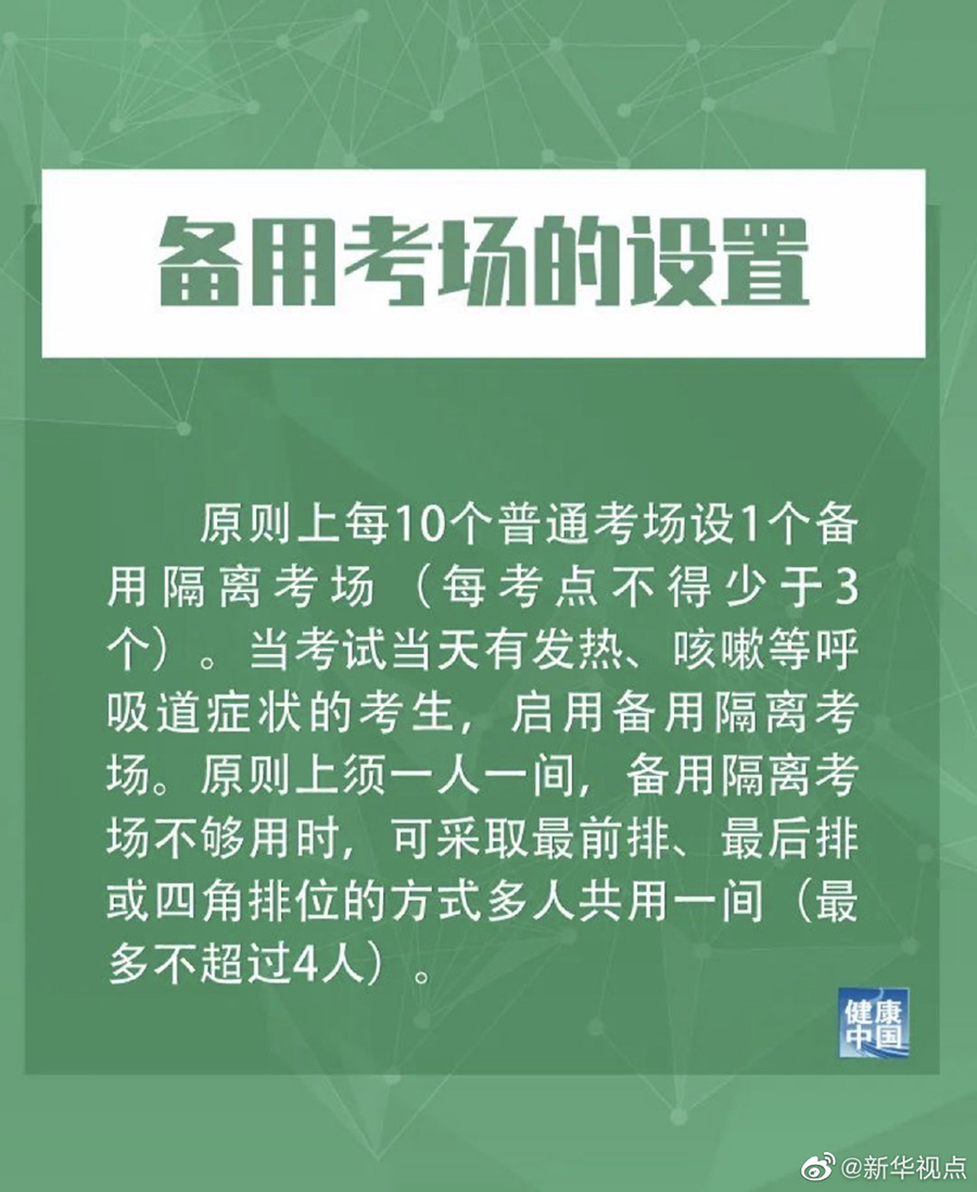 對于備用考場的設置,措施提到,原則上每10個普通考場設1個備用隔離考場(每考點不得少于3個)。當考試當天有發(fā)熱、咳嗽等呼吸道癥狀的考生,啟用備用隔離考場。原則上須一人一間,備用隔離考場不夠用時,可采取最前排、最后排或四角排位的方式多人共用一間(最多不超過4人)。