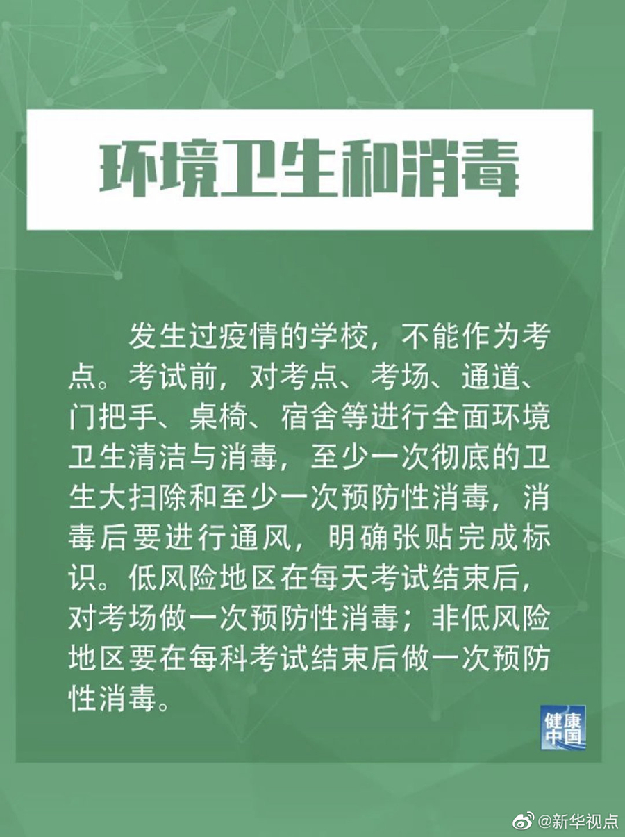 措施提到,發(fā)生過疫情的學校,不能作為考點。低風險地區(qū)在每天考試結束后,對考場做一次預防性消毒;非低風險地區(qū)要在每科考試結束后做一次預防性消毒。