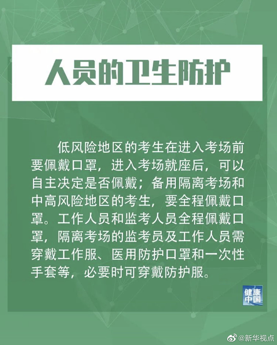措施提到,低風險地區(qū)的考生在進入考場前要佩戴口罩,進入考場就座后,可以自主決定是否佩戴;備用隔離考場和中高風險地區(qū)的考生,要全程佩戴口罩。工作人員和監(jiān)考人員全程佩戴口罩,隔離考場的監(jiān)考員及工作人員須穿戴工作服、醫(yī)用防護口罩和一次性手套等,必要時可穿戴防護服。
