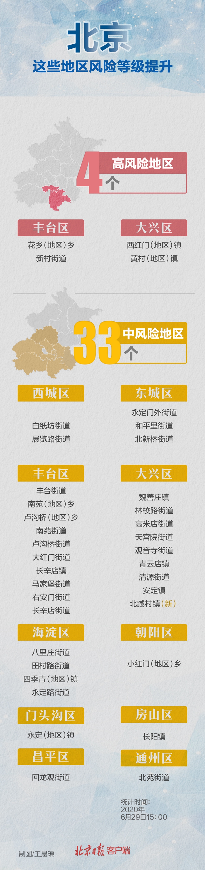 北京日報客戶端記者據國務院客戶端小程序“疫情風險等級查詢”更新情況,截至6月29日15時,北京市大興區(qū)北臧村鎮(zhèn)由低風險調整為中風險。