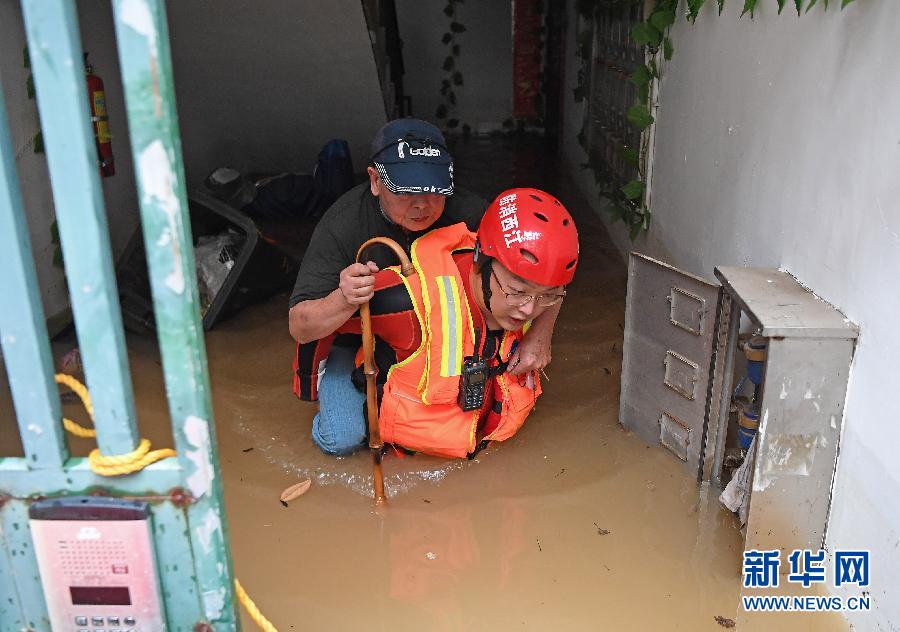 7月8日,在景德鎮市金悅小區,救援人員轉移受困群眾。 新華社記者 萬象 攝