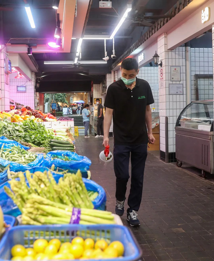 6月16日,在上海市一家菜場內(nèi),工作人員在進(jìn)行消毒工作 丁汀 攝