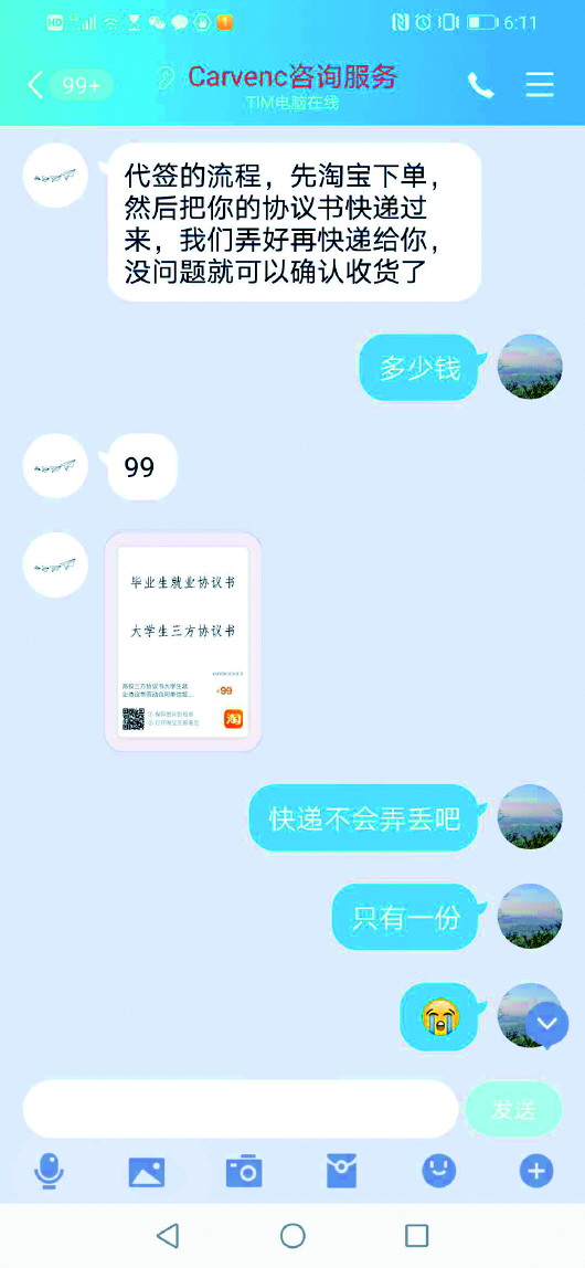 淘寶網(wǎng)上有多家能代簽三方協(xié)議的商家。在看到記者“能否代蓋三方協(xié)議公章”的留言后,一家名為“carvenc education”的商家立即追問所在學(xué)校、專業(yè)。記者提供相關(guān)信息后,不到一分鐘,商家就發(fā)來相匹配的公司名稱和崗位,“只要99元,協(xié)議書真實(shí)有效,包回訪。”