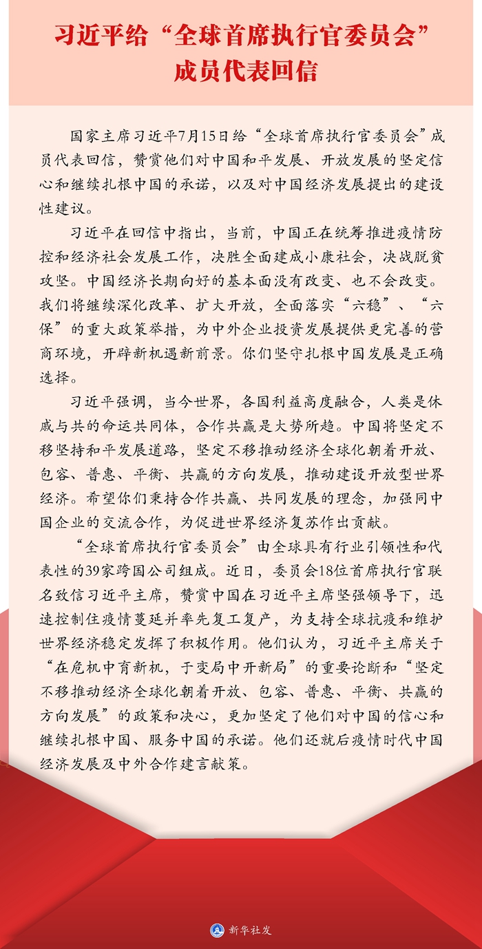 “全球首席執(zhí)行官委員會(huì)”由全球具有行業(yè)引領(lǐng)性和代表性的39家跨國公司組成。近日,委員會(huì)18位首席執(zhí)行官聯(lián)名致信習(xí)近平主席,贊賞中國在習(xí)近平主席堅(jiān)強(qiáng)領(lǐng)導(dǎo)下,迅速控制住疫情蔓延并率先復(fù)工復(fù)產(chǎn),為支持全球抗疫和維護(hù)世界經(jīng)濟(jì)穩(wěn)定發(fā)揮了積極作用。他們認(rèn)為,習(xí)近平主席關(guān)于“在危機(jī)中育新機(jī),于變局中開新局”的重要論斷和“堅(jiān)定不移推動(dòng)經(jīng)濟(jì)全球化朝著開放、包容、普惠、平衡、共贏的方向發(fā)展”的政策和決心,更加堅(jiān)定了他們對(duì)中國的信心和繼續(xù)扎根中國、服務(wù)中國的承諾。他們還就后疫情時(shí)代中國經(jīng)濟(jì)發(fā)展及中外合作建言獻(xiàn)策。