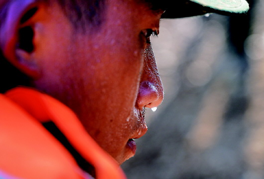 武警江西總隊上饒支隊的一名戰士臉上流下的汗水(7月14日攝)。新華社記者萬象攝