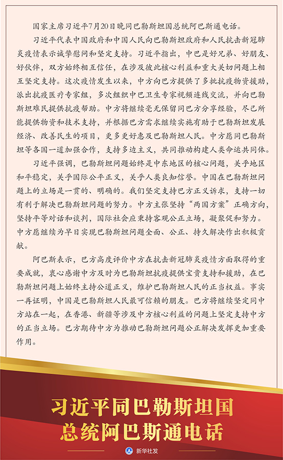 新華社北京7月20日電 國家主席習近平7月20日晚同巴勒斯坦國總統阿巴斯通電話。