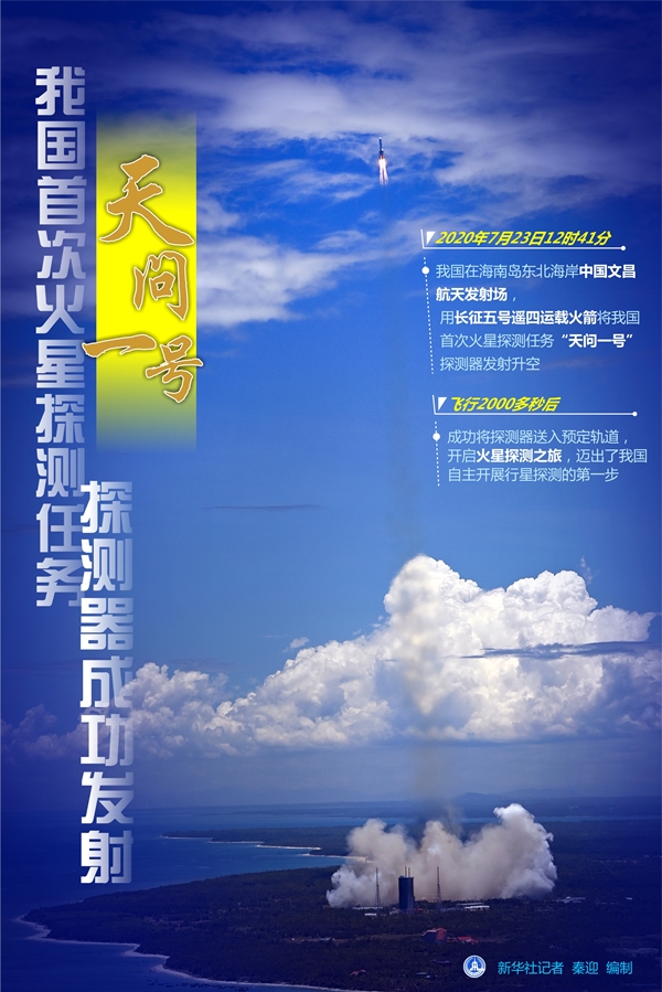 2020年7月23日12時41分,我國在海南島東北海岸中國文昌航天發(fā)射場,用長征五號遙四運載火箭將我國首次火星探測任務(wù)“天問一號”探測器發(fā)射升空,飛行2000多秒后,成功將探測器送入預(yù)定軌道,開啟火星探測之旅,邁出了我國自主開展行星探測的第一步。新華社記者 才揚 攝