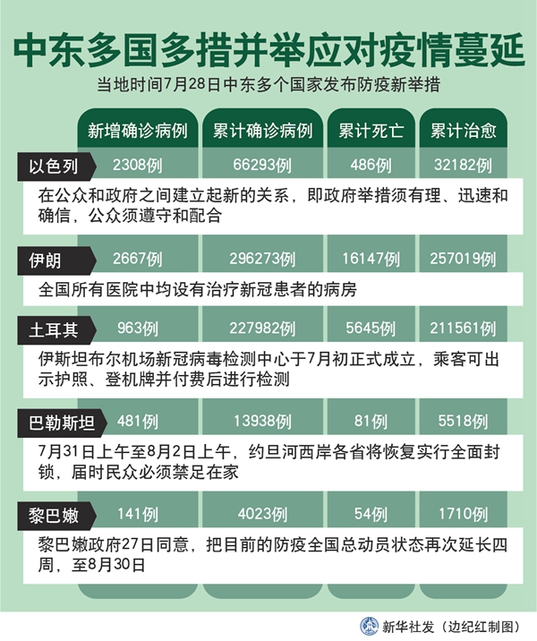 新華社突尼斯7月29日電 綜合新華社駐中東地區(qū)記者報(bào)道:為進(jìn)一步應(yīng)對中東多國持續(xù)蔓延的新冠疫情,同時防止因宰牲節(jié)人群聚集加劇疫情擴(kuò)散,中東多個國家28日發(fā)布防疫新舉措。