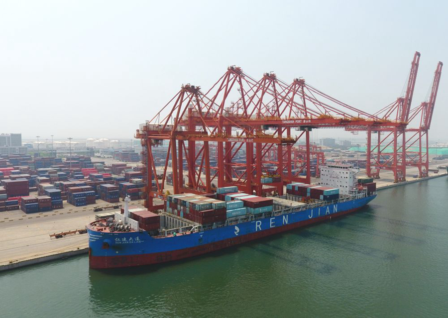7月16日,一艘輪船靠泊在唐山港京唐港區集裝箱碼頭裝貨。新華社記者 楊世堯 攝