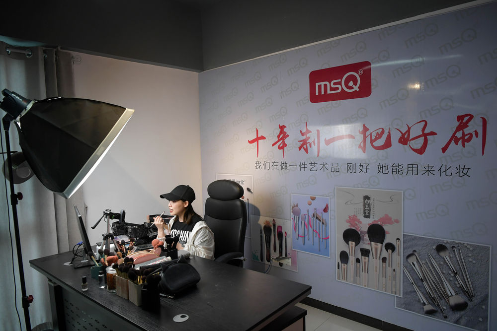 5月15日,在江西省南昌市青山湖區(qū)一家電商企業(yè)的直播間內(nèi),主播線(xiàn)上直播銷(xiāo)售化妝刷。新華社記者 彭昭之 攝