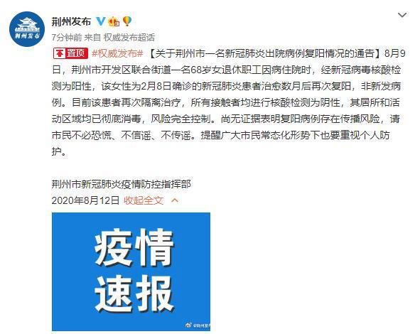 據(jù)湖北省荊州市新冠肺炎疫情防控指揮部12日通報,8月9日,荊州市開發(fā)區(qū)聯(lián)合街道一名68歲女退休職工因病住院時,經(jīng)新冠病毒核酸檢測為陽性,該女性為2月8日確診的新冠肺炎患者治愈數(shù)月后再次復(fù)陽,非新發(fā)病例。目前該患者再次隔離治療,所有接觸者均進(jìn)行核酸檢測為陰性,其居所和活動區(qū)域均已徹底消毒,風(fēng)險完全控制。尚無證據(jù)表明復(fù)陽病例存在傳播風(fēng)險,請市民不必恐慌、不信謠、不傳謠。提醒廣大市民常態(tài)化形勢下也要重視個人防護(hù)。