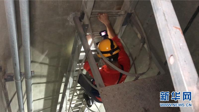 8月12日凌晨?jī)牲c(diǎn),贛州工務(wù)段贛州高鐵路橋工區(qū)工長(zhǎng)寧建平攀登檢查梯,檢查橋塔斜拉索上部鋼錨箱內(nèi)設(shè)備狀態(tài)。南昌鐵路局供圖