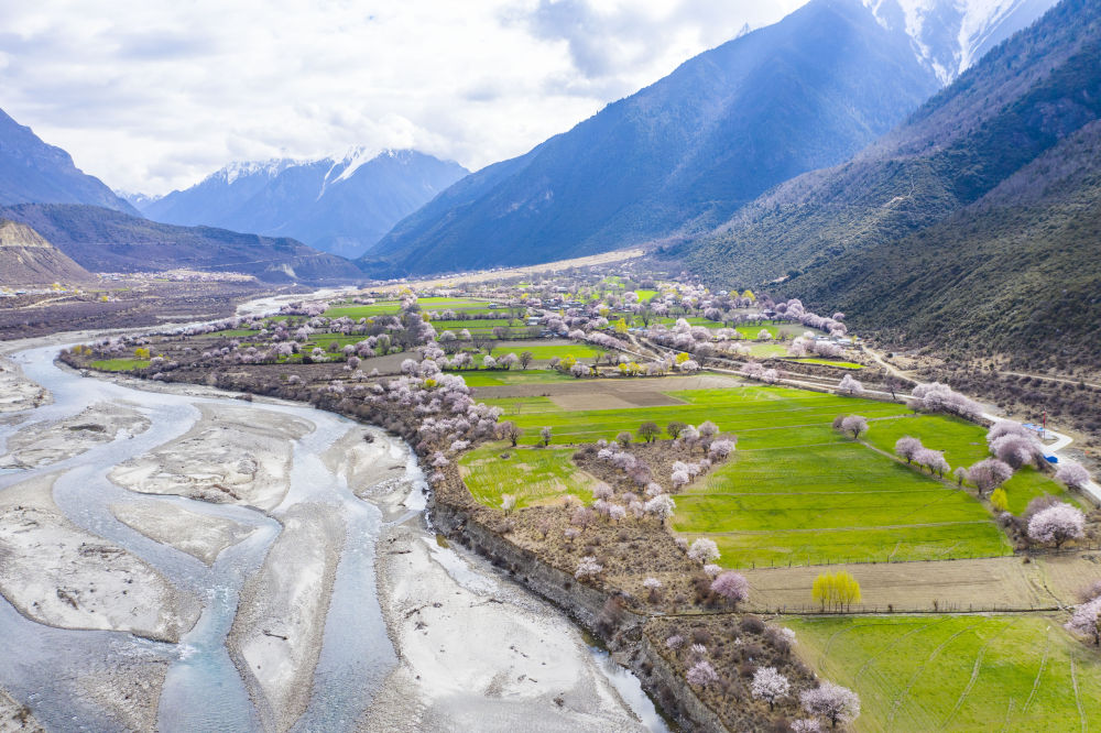 西藏林芝市波密縣境內桃花盛開的田園風光(3月26日攝,無人機照片)。新華社記者 普布扎西 攝