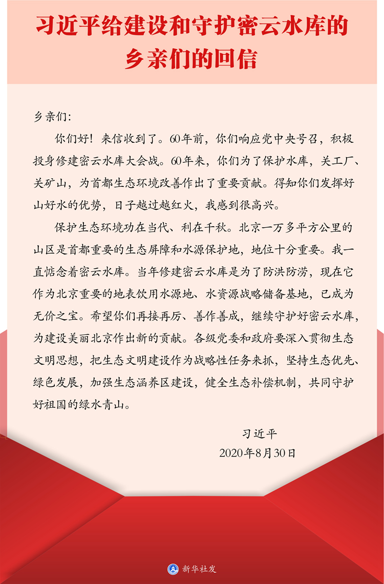 新華社北京8月31日電 習近平給建設和守護密云水庫的鄉親們的回信