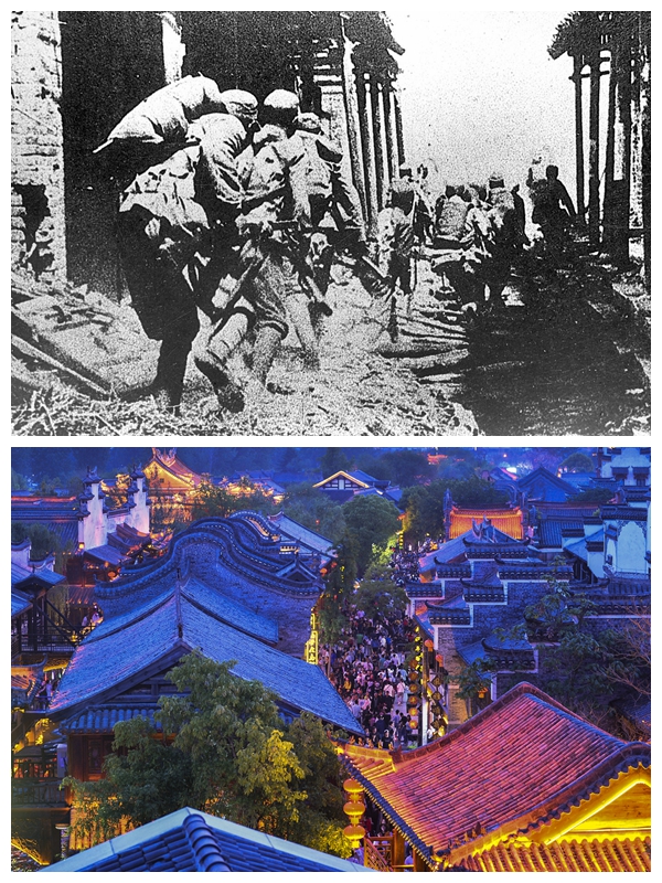 上圖為1937年8月13日至11月12日,中日軍隊(duì)進(jìn)行淞滬會(huì)戰(zhàn),這次會(huì)戰(zhàn)粉碎了日本軍國主義者速戰(zhàn)速?zèng)Q的迷夢。這是中國軍隊(duì)88師在上海閘北的環(huán)形工事里同日軍巷戰(zhàn)。