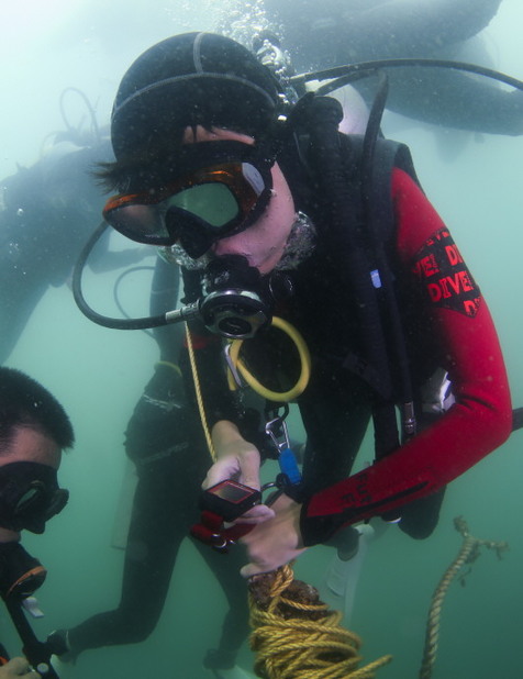 方堅澤扭動著身體滑進海里。等到教練在水中幫他安上40斤重的氣瓶,他慢慢地潛入海底。