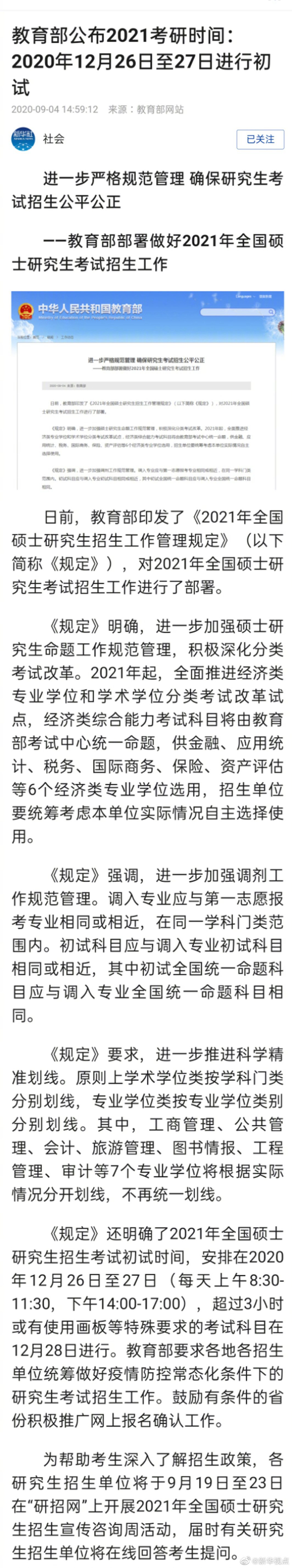 其中,明確了2021年全國碩士研究生招生考試初試時(shí)間,安排在2020年12月26日至27日(每天上午8:30-11:30,下午14:00-17:00),超過3小時(shí)或有使用畫板等特殊要求的考試科目在12月28日進(jìn)行。教育部要求各地各招生單位統(tǒng)籌做好疫情防控常態(tài)化條件下的研究生考試招生工作。鼓勵(lì)有條件的省份積極推廣網(wǎng)上報(bào)名確認(rèn)工作。