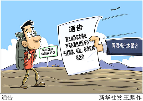 通告稱,自即日起,格爾木市公安局將通過聯管聯控協作機制,對擅自私自從格爾木前往可可西里自然保護區開展旅游、探險、非法穿越等活動,予以嚴厲打擊。凡是出租車、私家車由格爾木載客前往可可西里自然保護區的,一律必須先行前往公安機關備案。違者將依法依規嚴肅處理。