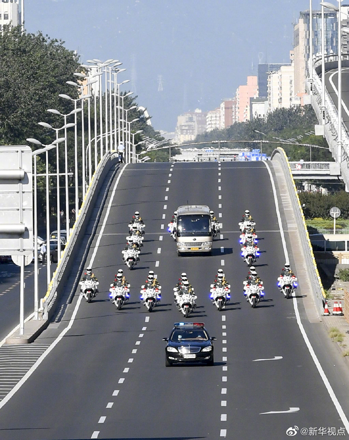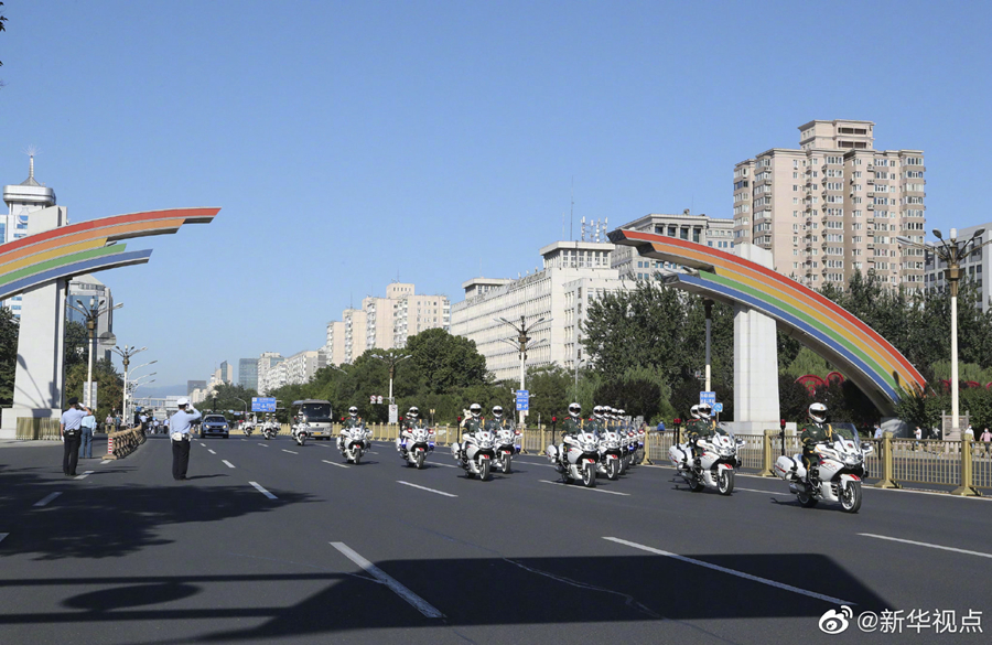 國家勛章和國家榮譽稱號獲得者集體乘坐禮賓車從住地出發,由國賓護衛隊護衛前往人民大會堂。(攝影 丁林 高潔 劉彬)