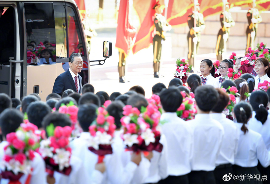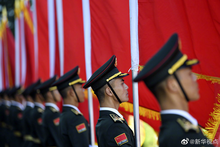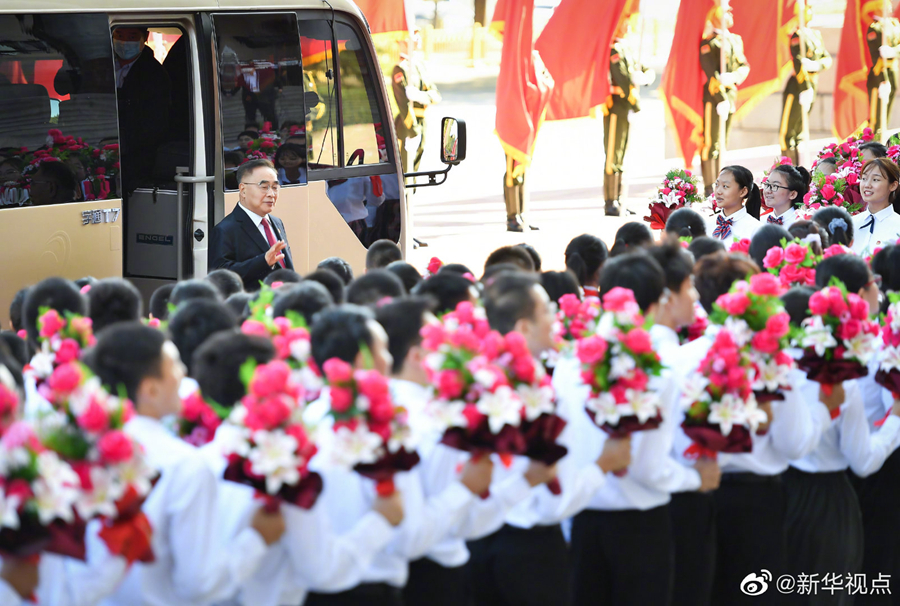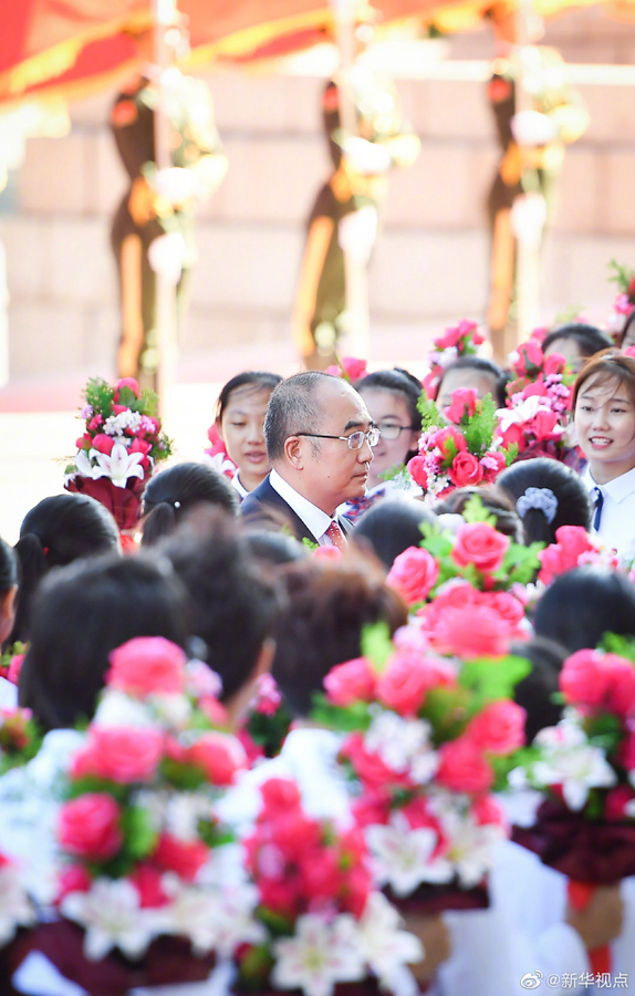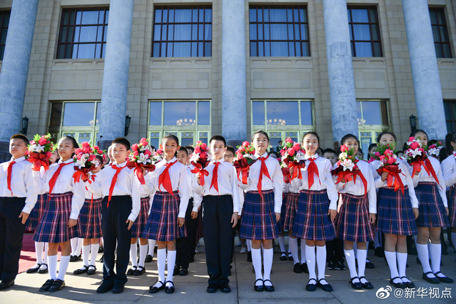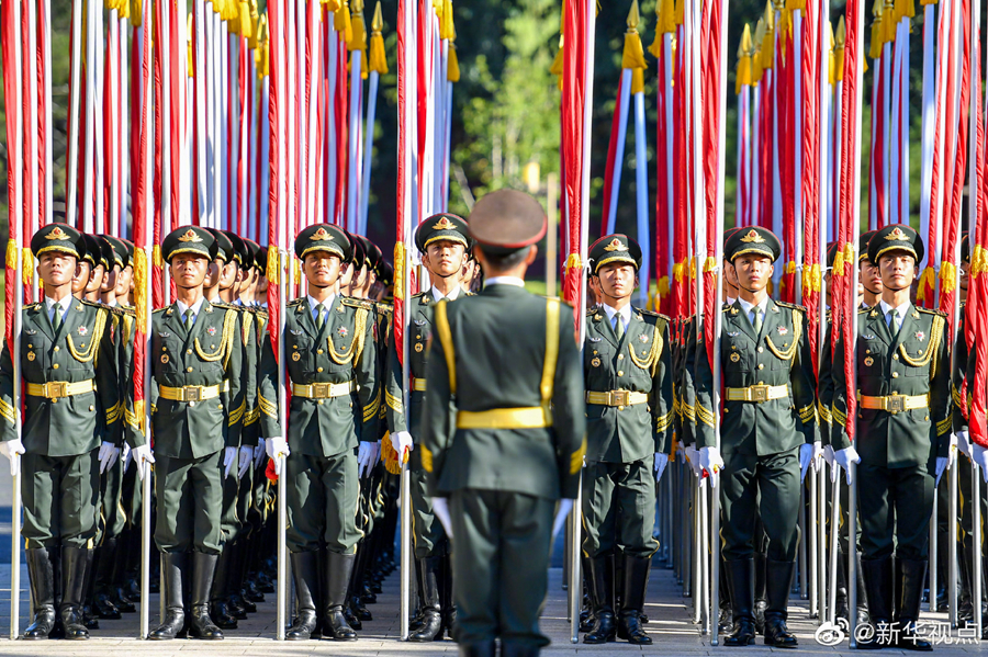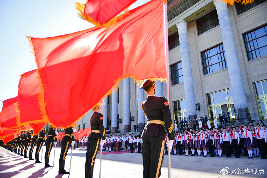 人民大會堂北門外,高擎紅旗的禮兵分列道路兩側(cè),肩槍禮兵在臺階上莊嚴佇立,青少年熱情歡呼致意。國家勛章和國家榮譽稱號獲得者沿著紅毯拾級而上,進入人民大會堂。(攝影 龐興雷 劉彬 殷博古 李響)