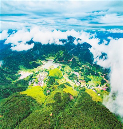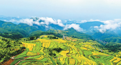 鳥瞰浙江省臺州市仙居縣朱溪鎮楊豐山金色梯田美景。 王華斌攝(人民圖片)