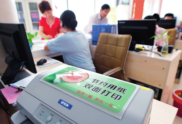 合肥市蜀山區(qū)文博苑社區(qū)的打印機貼著“節(jié)約用紙 雙面打印”的標識 郭晨攝 / 本刊