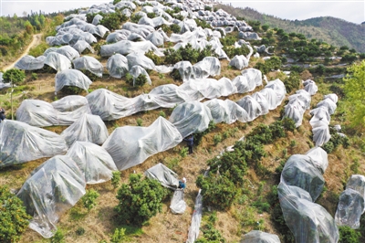 用薄膜作為重要農業生產資料被廣泛使用,圖為貴州省黔東南苗族侗族自治州榕江縣砂糖橘種植基地,村民為砂糖橘覆蓋農膜保溫。新華社記者 楊楹攝