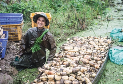 蓮藕是湖北省重要的特色農(nóng)產(chǎn)品。吳祺經(jīng)歷了蓮藕畝產(chǎn)從不足1000公斤到2000多公斤的跨越,也見證了從幾毛錢一公斤鮮藕到1元錢一小袋蓮藕制成品零食的增值。“這些影響賣相的‘邊角料’也有用,可以加工成藕粉。”他拿起幾節(jié)被掰掉的藕頭說。