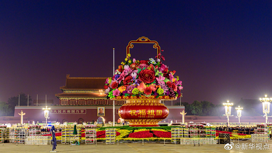 據悉,大花籃以喜慶的花果籃為主景,花籃為鋼架結構,籃身為玻璃鋼材質,籃盤直徑12米,花壇底部直徑45米。在籃體南側書寫“祝福祖國,1949-2020”字樣,在籃體北側書寫 “萬眾一心,1949-2020”字樣?;@內共使用了125枝大型仿真花,籃底部花壇則使用我國自育花園小菊“絢秋星光”與一品紅組成10顆紅心的圖案。