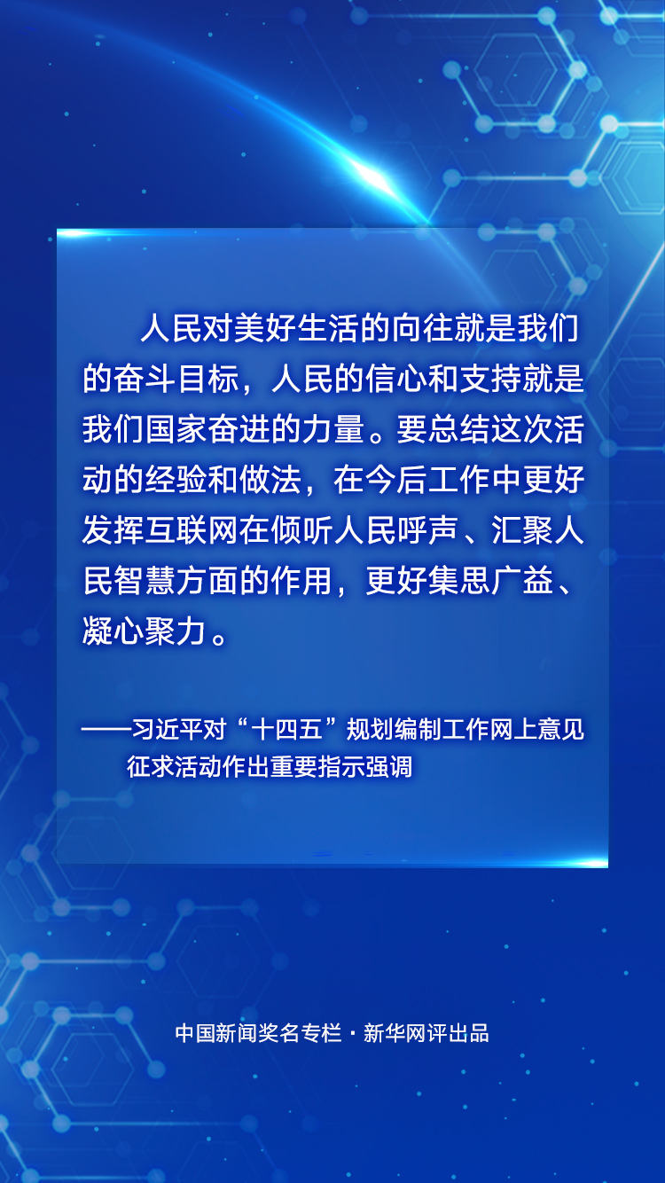 人心向背、力量對比決定事業成敗。實現“兩個一百年”奮斗目標,需要全社會方方面面同心干,需要畫出網上網下最大同心圓。通過互聯網就“十四五”規劃編制向全社會征求意見和建議,在我國五年規劃編制史上是第一次。這個“第一次”很有意義,要總結經驗和做法,在今后工作中更好利用互聯網這一平臺、途徑、渠道集思廣益。網民的意見和建議很有建設性,要及時梳理分析、認真吸收,真正做到從群眾中來到群眾中去,把“十四五”規劃編制好,為實現億萬人民的偉大夢想凝心聚力。(文字:馬若虎 海報:樊珊珊)